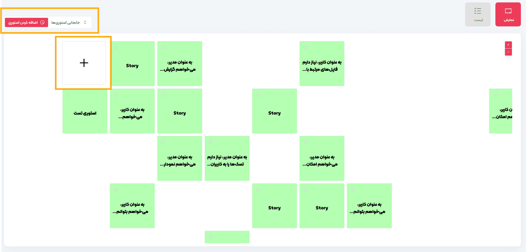 با کلیک بروی اضافه کردن استوری مطابق تصویر یک باکس با + نمایش داده میشود که هر کجا صفحه کلیک کنید یک استوری برای شما ایجاد خواهد شد.